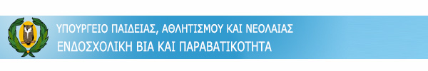Καλωσορίσατε στην ιστοσελίδα του Υπουργείου Παιδείας, Αθλητισμού και Νεολαίας (ΥΠΑΝ) που αφορά στα θέματα πρόληψης και αντιμετώπισης της βίας και παραβατικότητας στο σχολείο.
